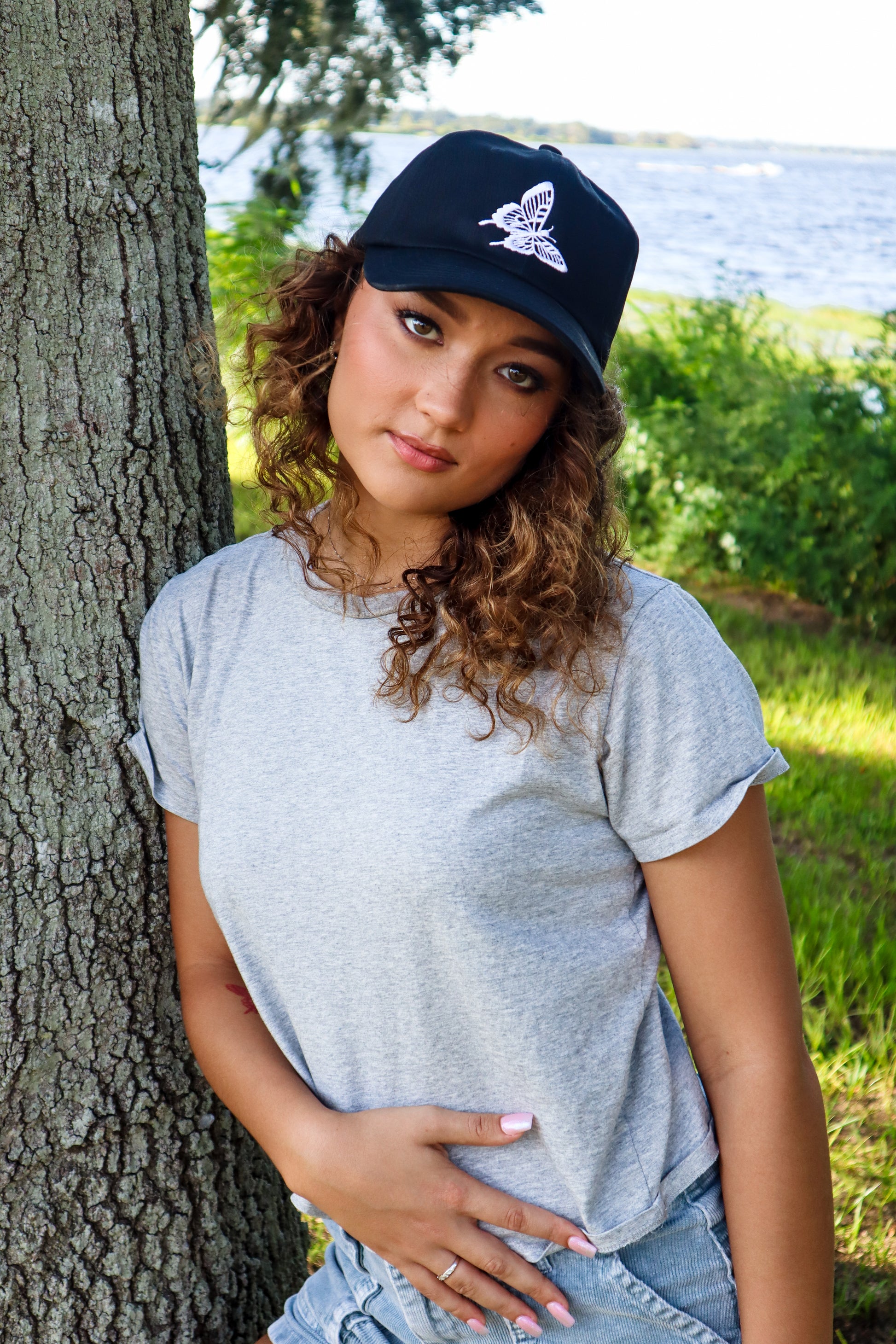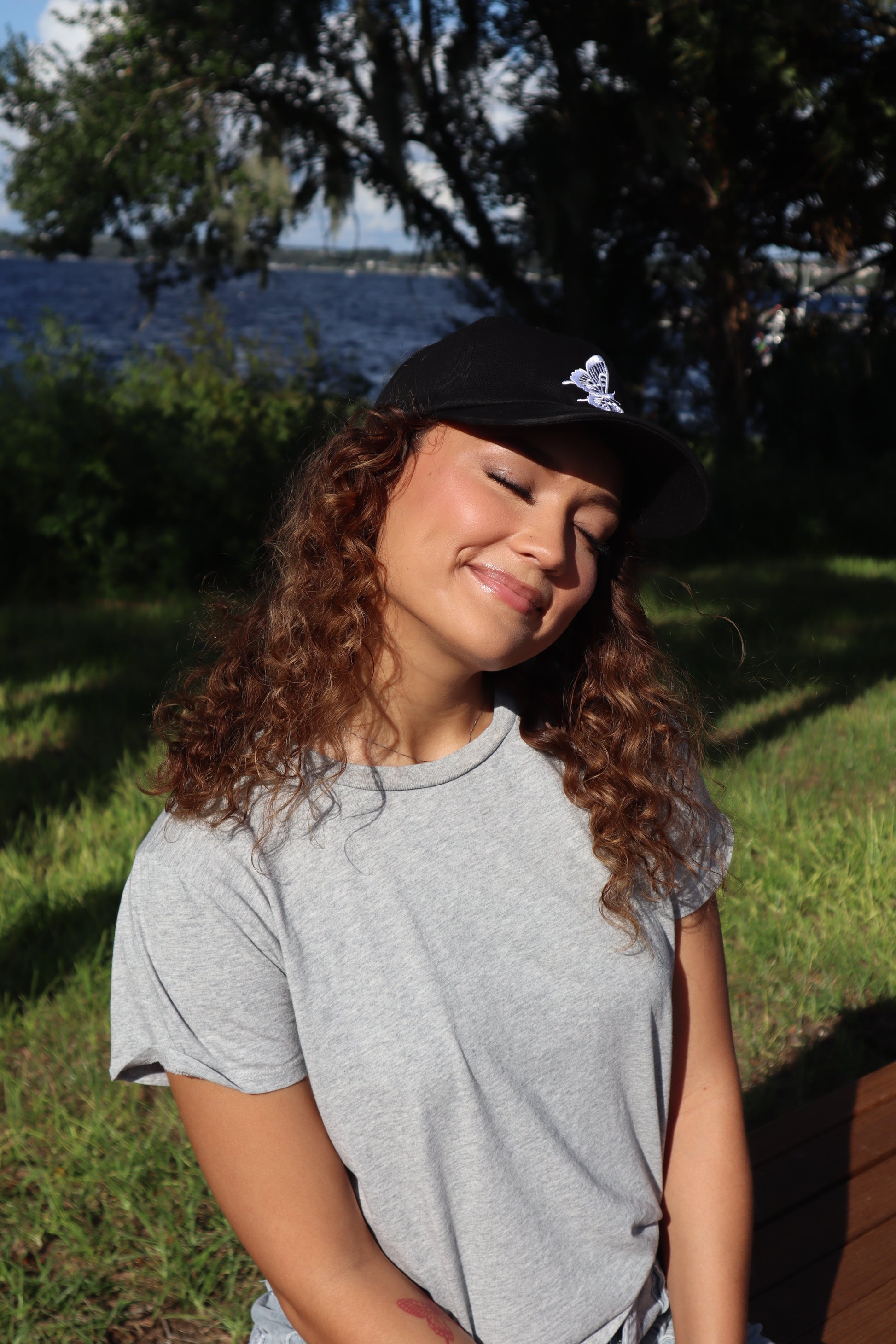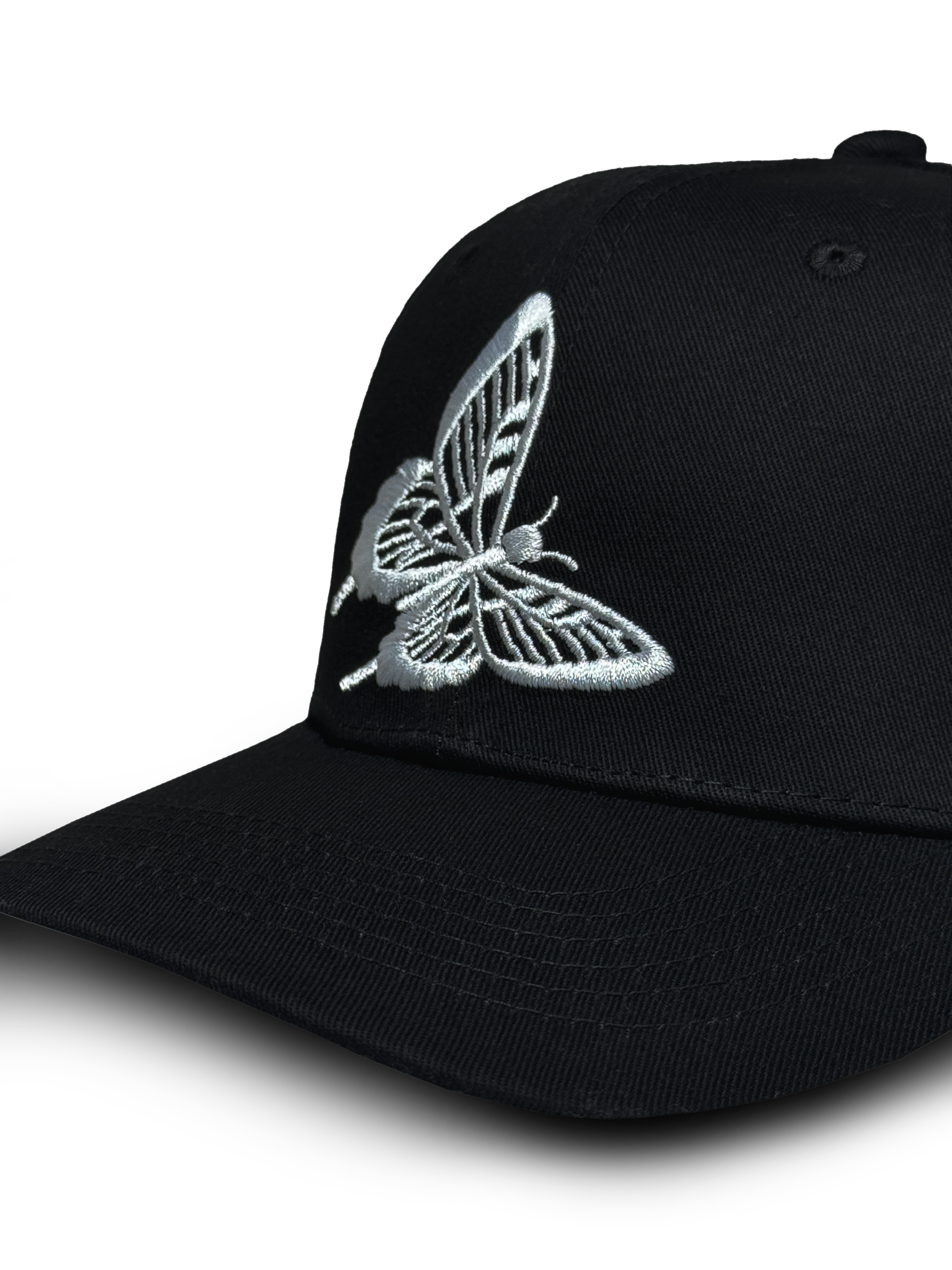 Official Butterfly Effects: Makeup by Marcos Gabriel branded trucker hat featuring an embroidered butterfly on the front and the inspirational message "BE FREE" on the back.